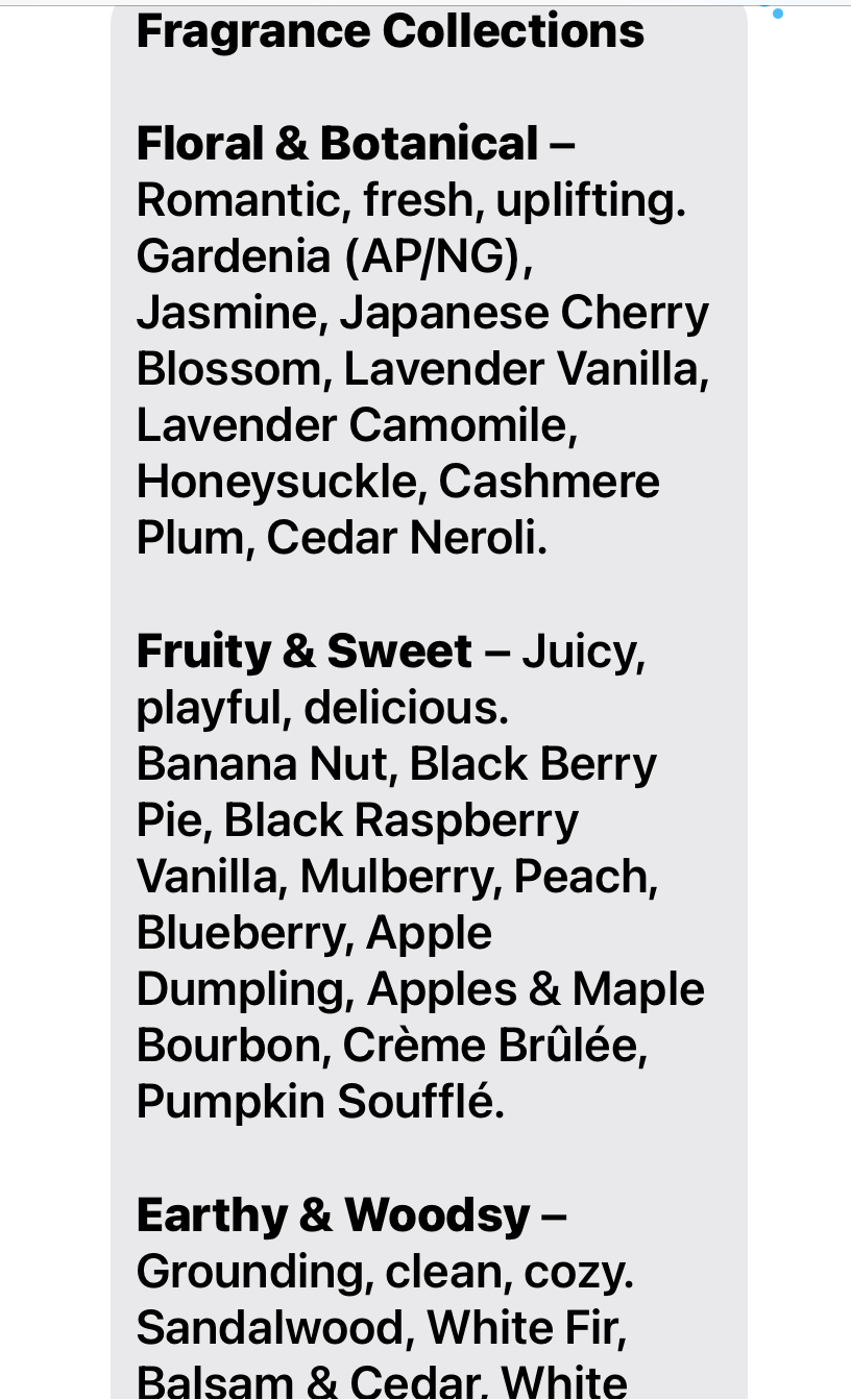 Gardenia (AP/NG), Jasmine, Japanese Cherry Blossom, Lavender Vanilla, Lavender Camomile, Honeysuckle, Cashmere Plum, Cedar Neroli.