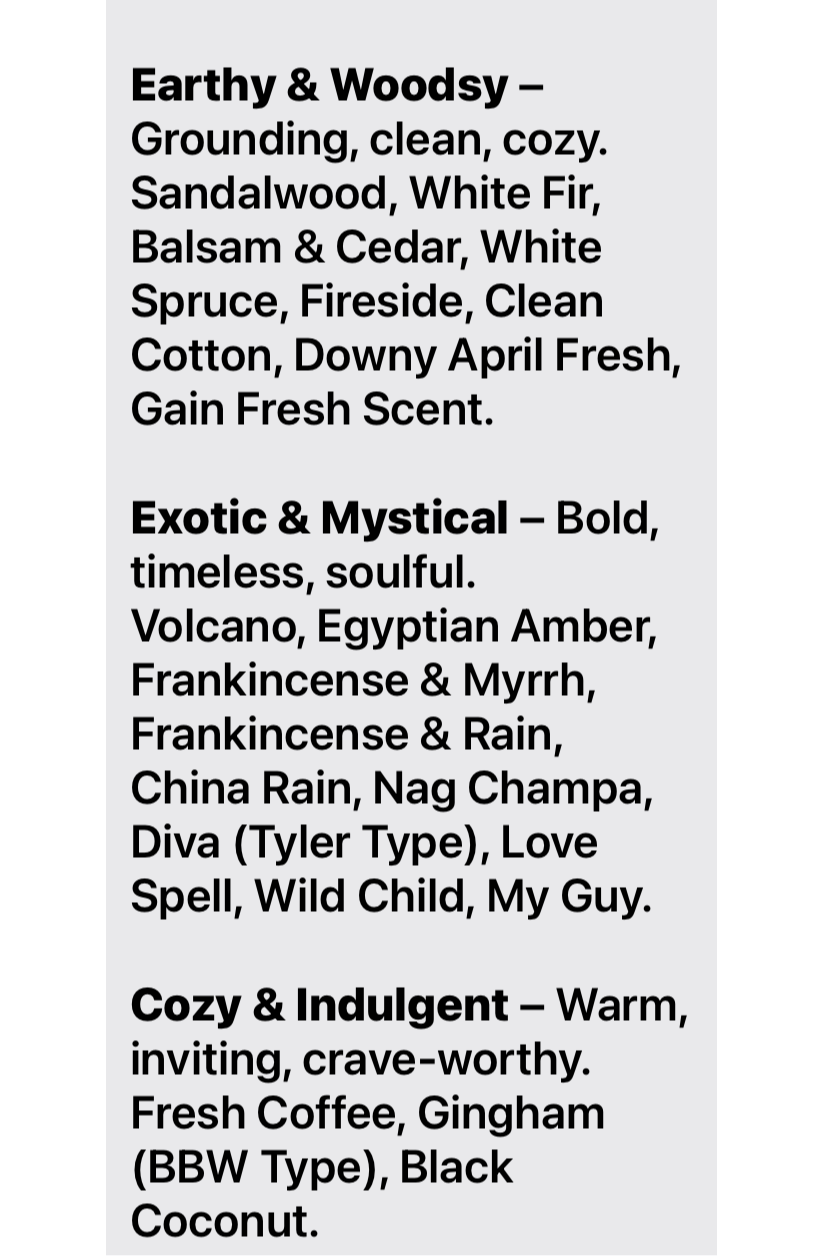Volcano, Egyptian Amber, Frankincense & Myrrh, Frankincense & Rain, China Rain, Nag Champa, Diva (Tyler Type), Love Spell, Wild Child, My Guy.