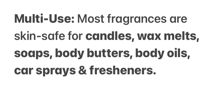 Multi-Use: Most fragrances are skin-safe for candles, wax melts, soaps, body butters, body oils, car sprays & fresheners.