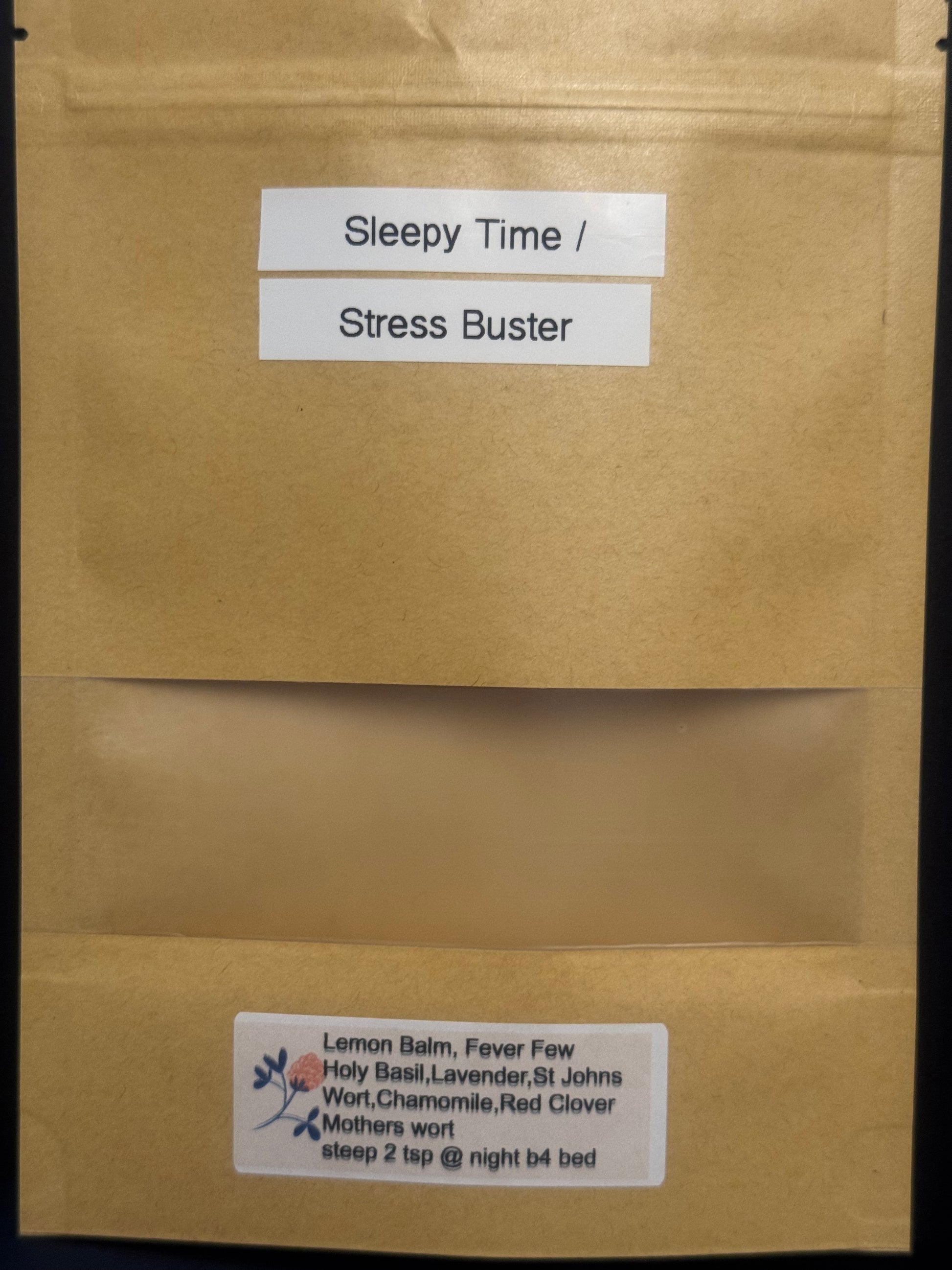 Stress Buster/Sleepy Time Tea ingredients, a proprietary blend of lemon balm, feverfew holy basil, lavender St. John’s wort, chamomile, Red Clover,& Mother’s wort